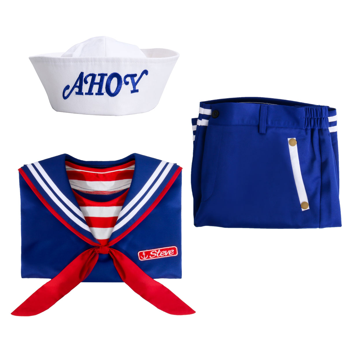 - incluye una parte superior azul y pantalones cortos con franjas blancas, una etiqueta de nombre»Steve», un sombrero de»Ahoy».